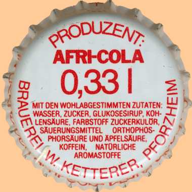 | Brauerei W. Ketterer KG, Pforzheim | Afri Cola Brauerei W. Ketterer Pforzheim Abgefüllt mit Genehmigung der Afri-Cola Bluna Centrale GmbH Köln | Afri-Cola |