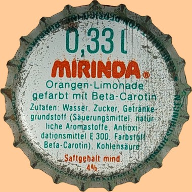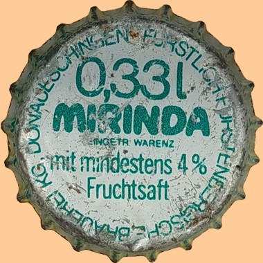 | Fürstlich Fürstenbergische Brauerei KG, Donaueschingen | Mirinda 0,33 l Fürstlich Fürstenbergische Brauerei KG Donaueschingen 4 % Randschrift: Hergestellt mit Genehmigung der Pepsico, Inc., Purchase N. Y. |