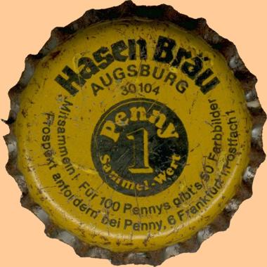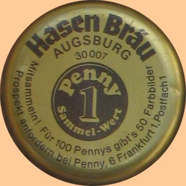 | Hasen-Bräu AG, Augsburg | Hasen-Bräu Augsburg 1 Penny Sammelwert Mitsammeln! Für 100 Pennys gibt`s 50 Farbbilder Prospekt anfordern bei Penny, 6 Frankfurt 1, Postfach 1 | Logo | ![]() |